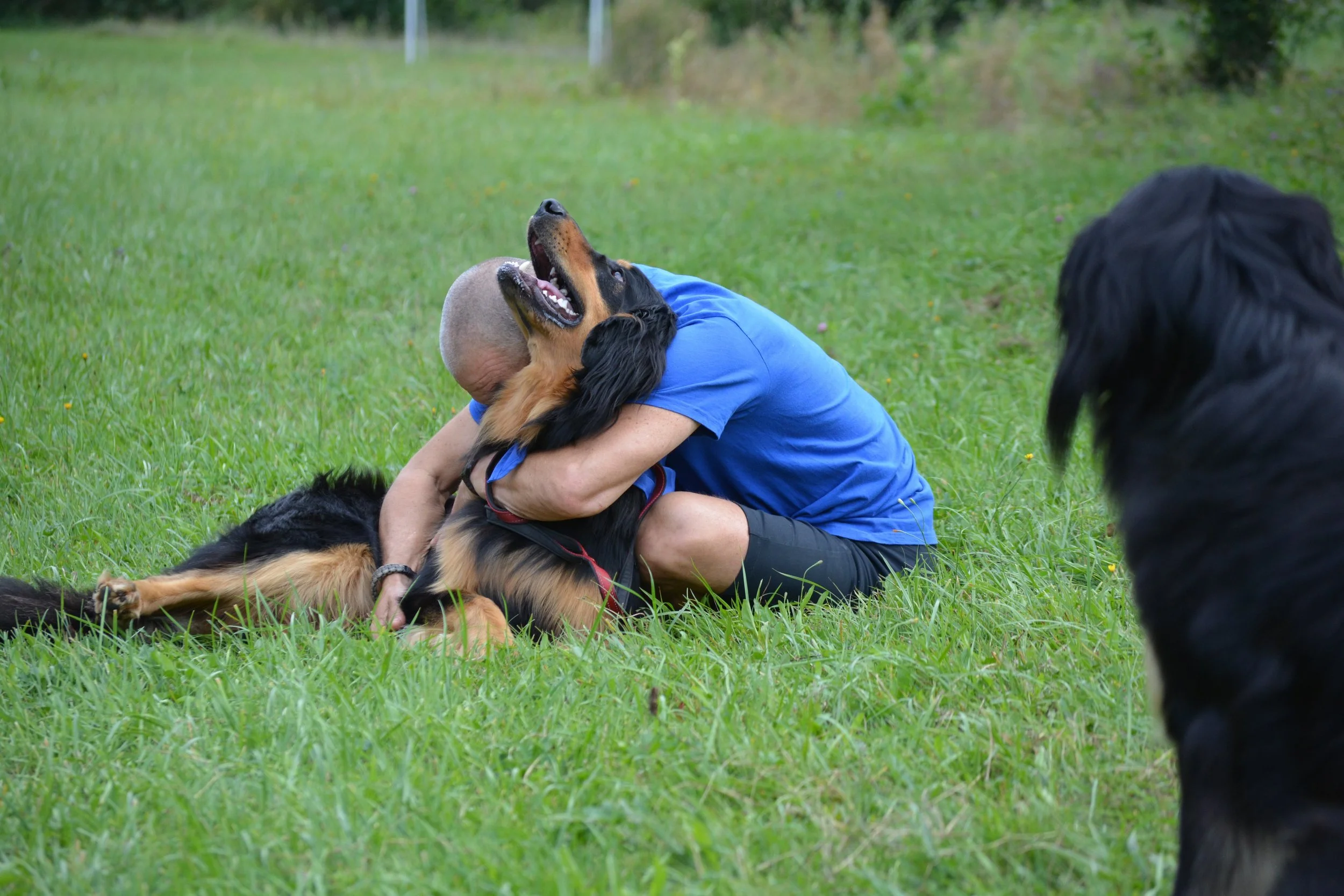 Veselje pa je bilo toliko večje, da naše organizatorje niste pustili dolgo čakati. Toliko truda in dela so vložili, da bi vsem nam ustregli. Naša edina naloga pa je bila, da se pripeljemo in sodelujemo. To smo tudi storili. Zbrali smo se ljubitelji pasme, lastniki v spremstvu svojih lepotcev. Hovi druščina je štela 76 ljudi in 38 psov. Tokrat smo bili najštevilčnejši. Spremljali so nas pasemski predstavniki v starosti od 14 let do najmlajšega komaj 3 mesece starega hovija. Črni z ožigi, zlatorumeni in še dve črni prdstavnici. Tanja in Tea pa sta tako skrbno poskrbeli za označevanje poti do piknik prostora, da sta nas prišla pozdravit tudi nemški par v spremstvu svojega hovi plemenjaka. Vsa navdušena nad nami sta se želela tudi malo podružiti, preden sta nadaljevala svojo pot, in mi smo jih seveda z veseljem sprejeli med nas.
